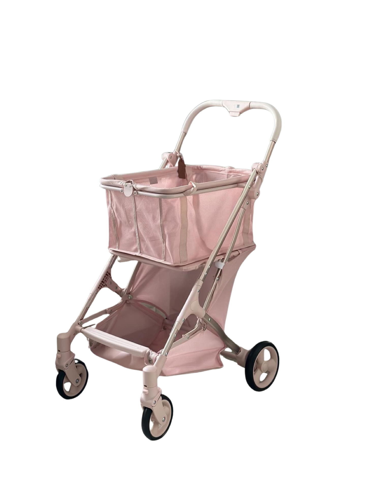 العربه باللون الوردي الفريد والفاخر الذي يمثل اللون الوردي النادر لزهرة الكرز أو شجرة الساكورا اليابانية.مصنوع من الجلد الصناعي والبوليستر المتين عالي الجودة مع إطار من الألومنيوم خفيف الوزن لمساعدتك على التسوق بدون استخدام اليدين وبفخامة.