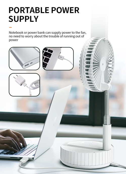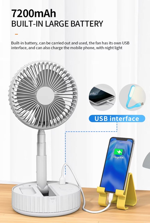مروحة عملية للاستخدام اليومي، قابلة للطي وسهلة الحمل. تعمل ببطارية مدمجة سعة 7200mAh وتدعم التشغيل عبر USB. مناسبة للبيت، المكتب، السفر، أو عند انقطاع الكهرباء.