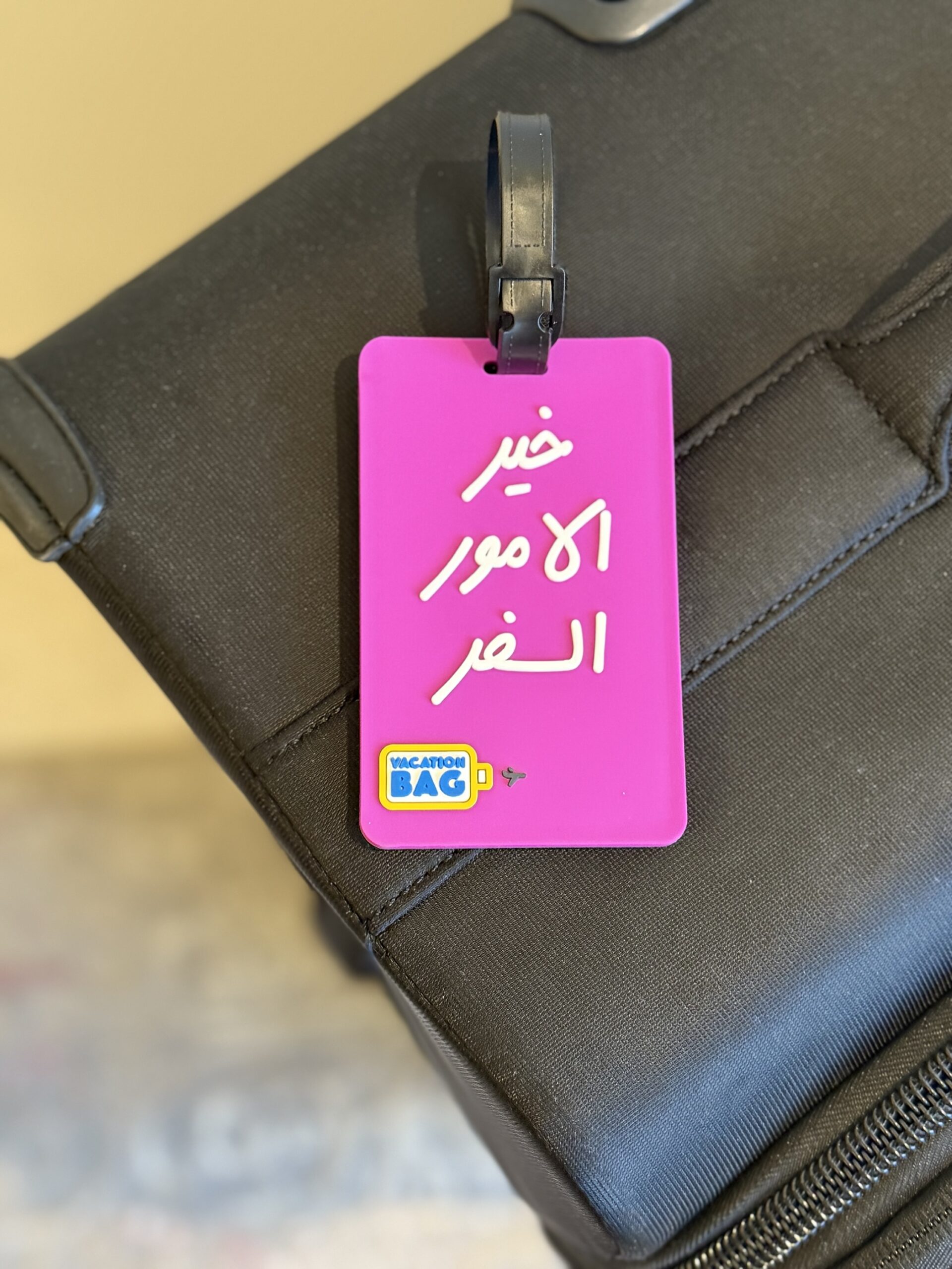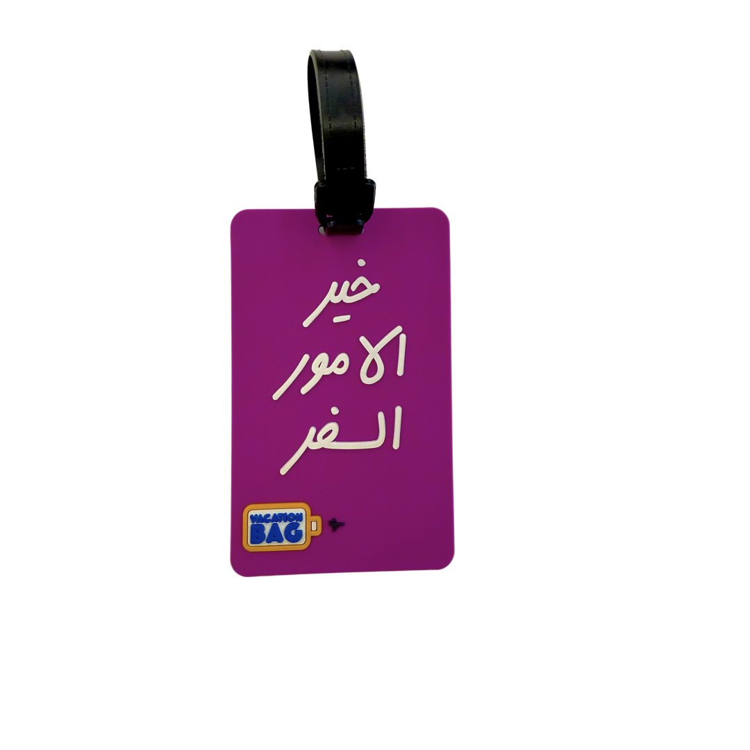 Durable plastic, writable back card, black strap, and Vacation Bag logo.